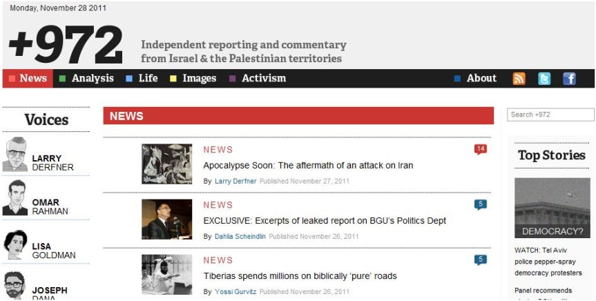 Ecco un sito in lingua inglese, “+972” un giornale un line di giornalisti indipendenti che scrivono sul territorio tra Palestina ed Israele, vi consiglio prima di tuffarvi nella sua lettura, di leggere la pagina ABOUT, in particolare oggi mi sono soffermato sull’ultimo articolo di Larry Derfner, Apocalypse Soon: The aftermath of an attack on Iran. Anche questo in inglese. Leggete abstract di Larry Derfner, su chi è e cosa ha fatto, è utile ad inquadrare il suo punto di vista.