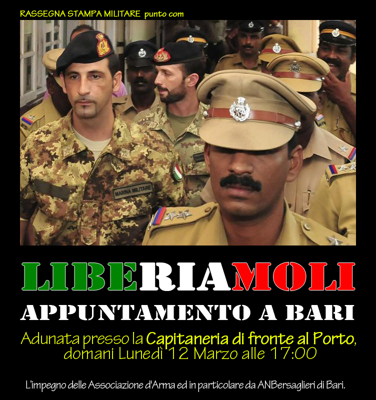 E, non possiamo non sostenere la ‘chiamata’ del quotidiano alla solidarietà verso i nostri due marinai ancora impossibilitati a rientrare in Italia. La richiesta è ora appoggiata via email anche da un generale dell’esercito ormai in pensione, ma attivo e partecipe al sistema difesa Italia, alla costruzione dei valori dell’Italia, alla salvaguardia della società di una comunità di ufficiali di tutte le armi. Intorno a questa comunità si stringono le nostre famiglie. Mesi fa la comunità militare e di tutte le associazioni combattentistiche e d’arma pugliesi e lucane avevano manifestato ancora a favore di Latorre e Girone, come in effetti indica la locandina in alto. Il 23 scorso si è tenuta anche una manifestazione indetta dai familiari in Roma.