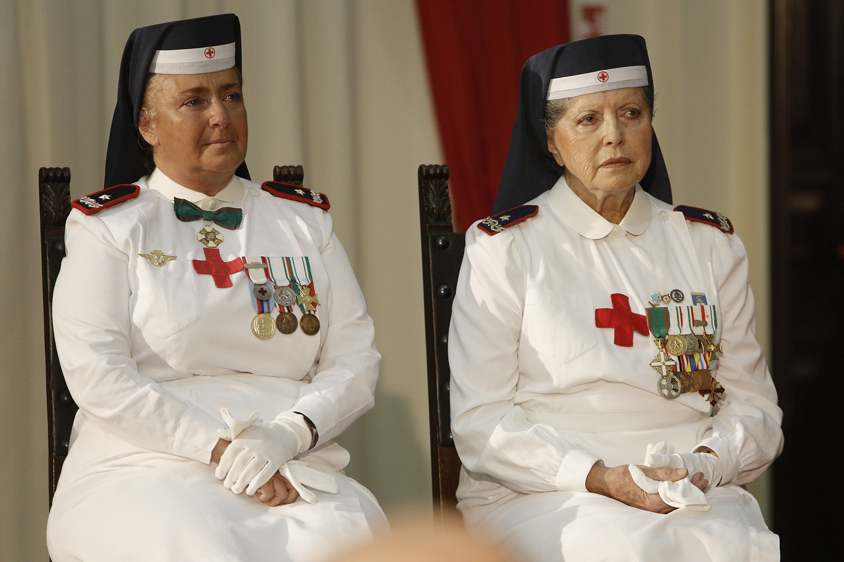La nuova Ispettrice nazionale Mila Braghetti Peretti (s) e l’Ispettrice uscente Monica Dialuce Gambino durante la cerimonia di avvicendamento al comando del Corpo delle Infermiere Volontarie della Croce Rossa, Roma 29 ottobre 2014. ANSA/GIUSEPPE LAMI